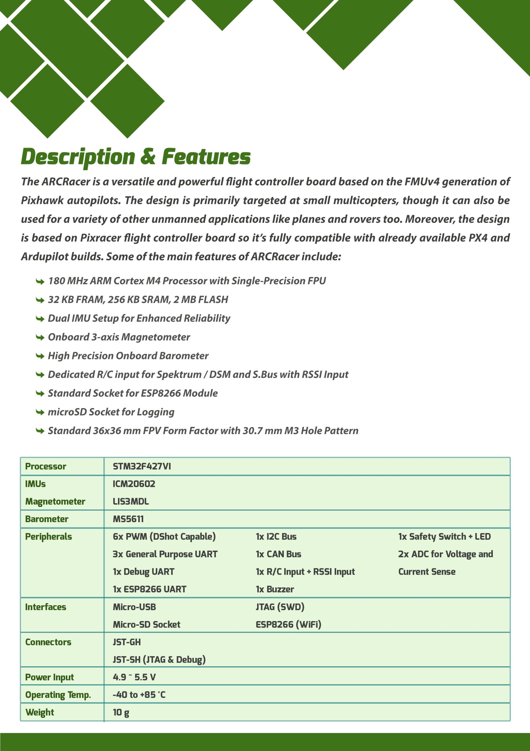 این برد از ورودیهای اختصاصی برای گیرندههای Spektrum / DSM و S.Bus همراه با ورودی RSSI پشتیبانی میکند. علاوه بر آن، یک درگاه استاندارد برای ماژول ESP8266 جهت اتصال وایفای و یک درگاه microSD برای ذخیره دادههای پرواز در نظر گرفته شده است. فرم فاکتور 36×36 میلیمتر با الگوی سوراخکاری 30.7 میلیمتر M3 نیز نصب آسان در قابهای FPV را ممکن میسازد.